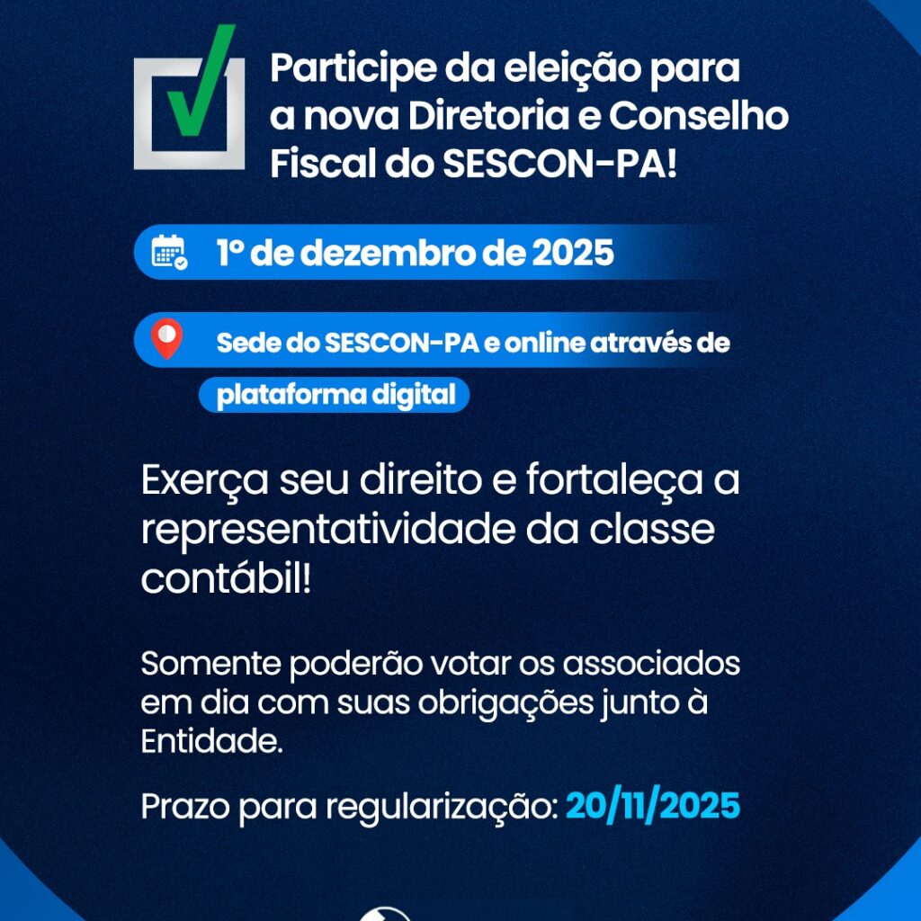 O SESCON-PA convida todos os associados a participarem da eleição para a nova Diretoria e Conselho Fiscal, que será realizada no dia 1º de dezembro de 2025, conforme o Regulamento Eleitoral.